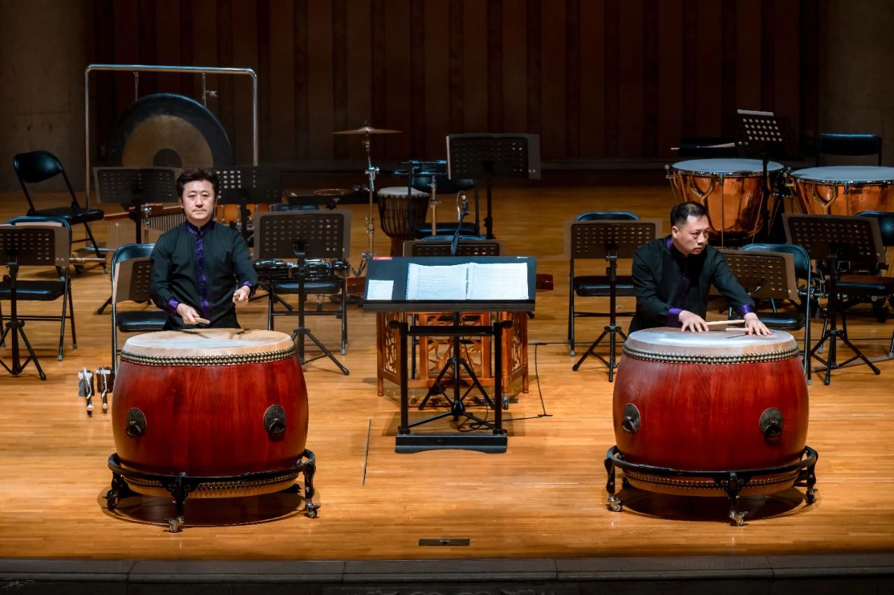 《牛斗虎》——两位打击乐演奏家默契合作,通过两面中国大鼓分别代表牛和虎,惟妙惟肖地展现牛之倔强刚悍和虎之威武勇猛。这首绛州鼓乐的经典曲目在舞台上的生动演绎极具观赏性。