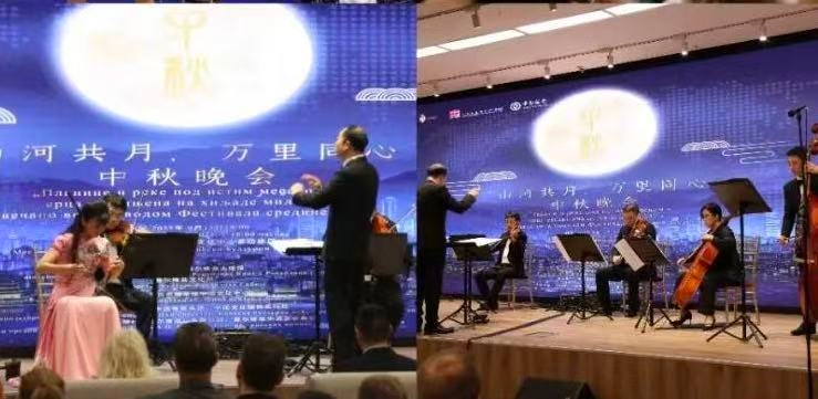 9月15日,艺术家们参演了由中国驻塞尔维亚使馆指导,贝尔格莱德中国文化中心主办的“天涯共此时”中秋系列活动的首场活动----“山河共月 万里同心”中秋晚会。乐团在指挥张冰冰带领下为观众们献上了《良宵》《二泉映月》《花好月圆》等中国经典名曲和三首巴尔干经典曲目,著名胡琴演奏家姜克美倾情演绎的《赛马》《夜深沉》惊艳了全场。艺术家们的精彩演出营造出浓浓的节日氛围。晚会最后,艺术家们还与塞尔维亚爱乐乐团的艺术家共同演奏《我的祖国》,用音乐生动诠释了两国人民“山河共月,万里同心”的深厚情谊,将整场晚会的气氛推向最高潮。