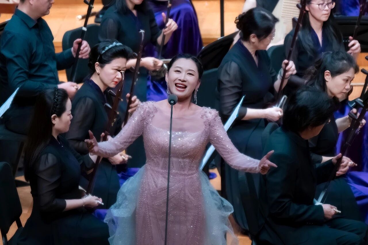经典红色歌曲联唱中,三位独唱演员以别样的温情将动人的乐章吟唱。《映山红》高亢婉转,《十送红军》绵长深情,《英雄赞歌》激昂豪迈,让红色旋律与七夕浪漫相融,将真挚的情感与英雄的赞歌紧密相连。梅派京剧名家胡文阁演绎的《梨花颂》,“梨花一枝春带雨” 的温婉与京剧的博大精深交织融合,既有古典美的雅致,又有深情的诉说,让东方美学的韵味在乐声中缓缓流淌。