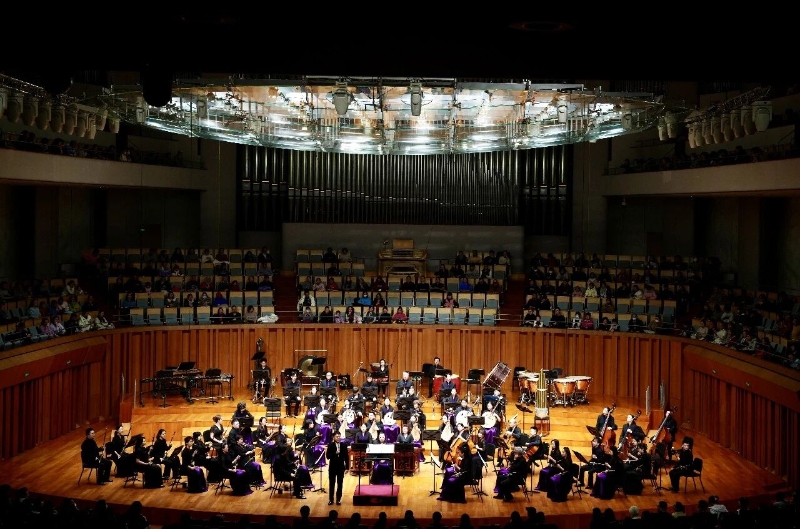 音乐会在《欢庆序曲》的激昂旋律中拉开帷幕,乐曲承载的节庆欢腾气息扑面而来。开场就营造出热烈喜庆的氛围。紧接着,以民族管弦乐编制进行编配的《红楼梦》组曲,为观众开启了一段古典文学名著与民族管弦乐交融的艺术旅程。这首源自87版电视剧《红楼梦》的经典配乐,既完整保留了原作的古典主义意蕴与美学,又通过丰富的乐器层次,让红楼梦的音乐故事更具听觉张力。
