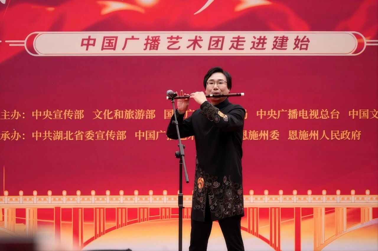 笛子独奏《牧民新歌》为现场带来了一缕草原清风。中国广播民族乐团青年笛箫演奏家张辉手中的竹笛,时而悠扬婉转,如草原牧歌随风飘荡;时而欢快活泼,似骏马奔腾踏响蹄声,带领建始的观众们沉醉在笛声营造的优美意境之中。