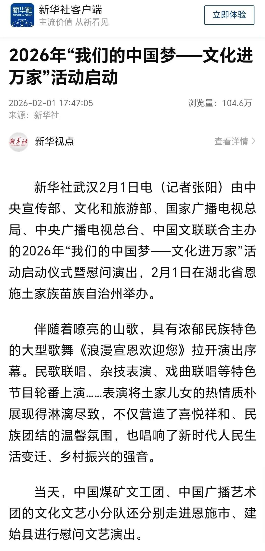 2月1日,恩施州建始县高坪镇地心谷广场人声鼎沸、欢歌笑语,洋溢着喜庆祥和的节日氛围——2026年“我们的中国梦·文化进万家”活动启动暨中国广播艺术团走进建始专场演出在这里温情启幕。国家级艺术院团的文艺小分队携手湖北省民族歌舞团的优秀演员和建始本土文艺骨干,为当地百姓带来了一场兼具艺术高度与民生温度的文化盛宴。演出现场座无虚席,观众沉浸在歌舞曲艺交织的欢乐海洋中,共同见证了优质文化资源扎根基层的生动实践。现场观演群众近1000人,同时吸引周边游客超2000人。中央广播电视总台、新华社等全国各级媒体对活动进行了专题报道。