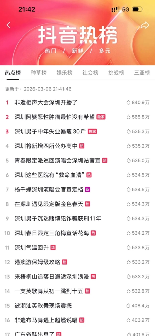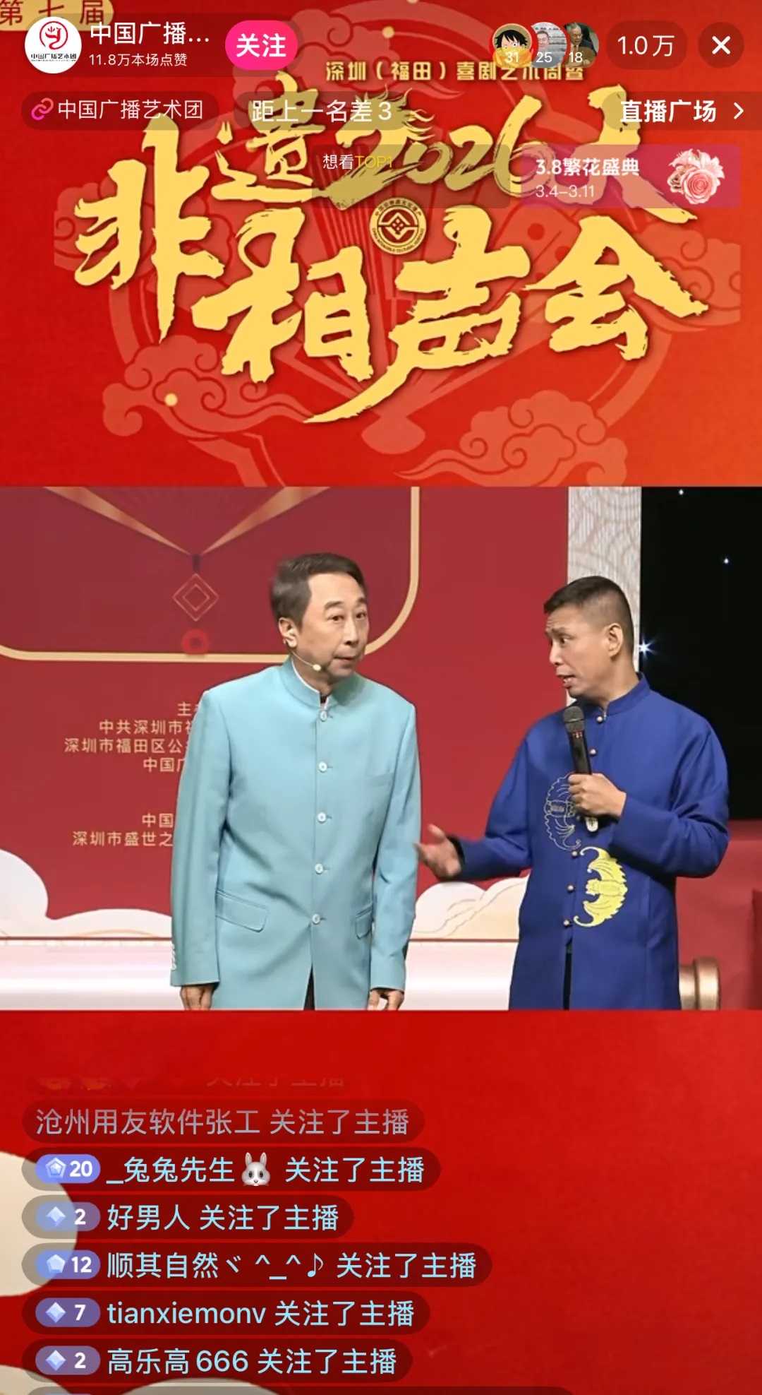 从剧场内的掌声如雷,到线上云端现象级的全民关注,3月6日的深圳,见证了非遗相声大会的“高光时刻”:132万演出直播观看人次,15万次点赞,抖音热榜达到840万热度,助推“非遗相声大会”强势制霸热搜榜首。这不仅是这一文化IP从线下盛宴向线上高地的跨维度跃迁,更是一次艺术与现实的深度共振。